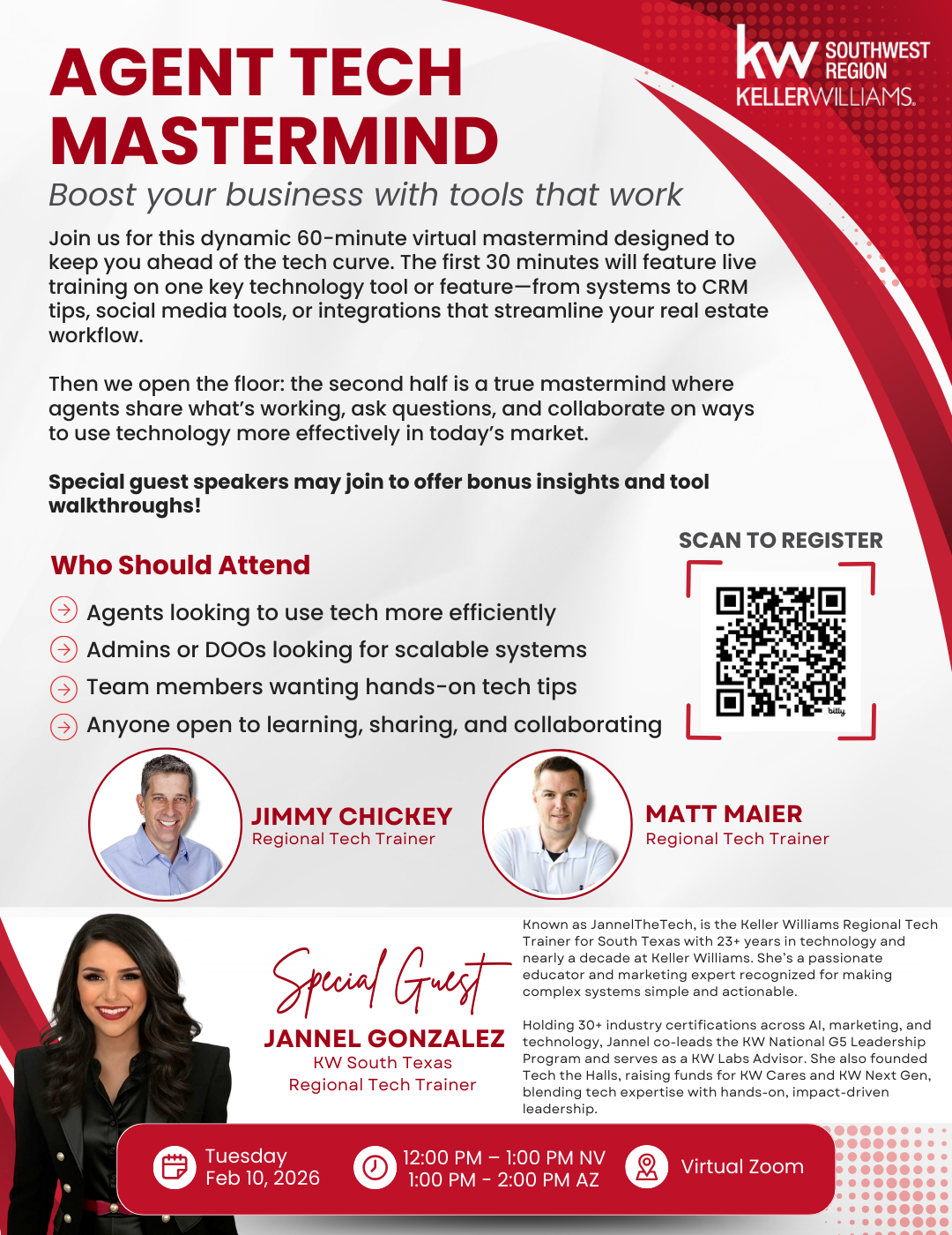 Boost your business with tools that work Join us for this dynamic 60-minute virtual mastermind designed to keep you ahead of the tech curve. The first 30 minutes will feature live training on one key technology tool or feature-from systems to CRM tips, social media tools, or integrations that streamline your real estate workflow.