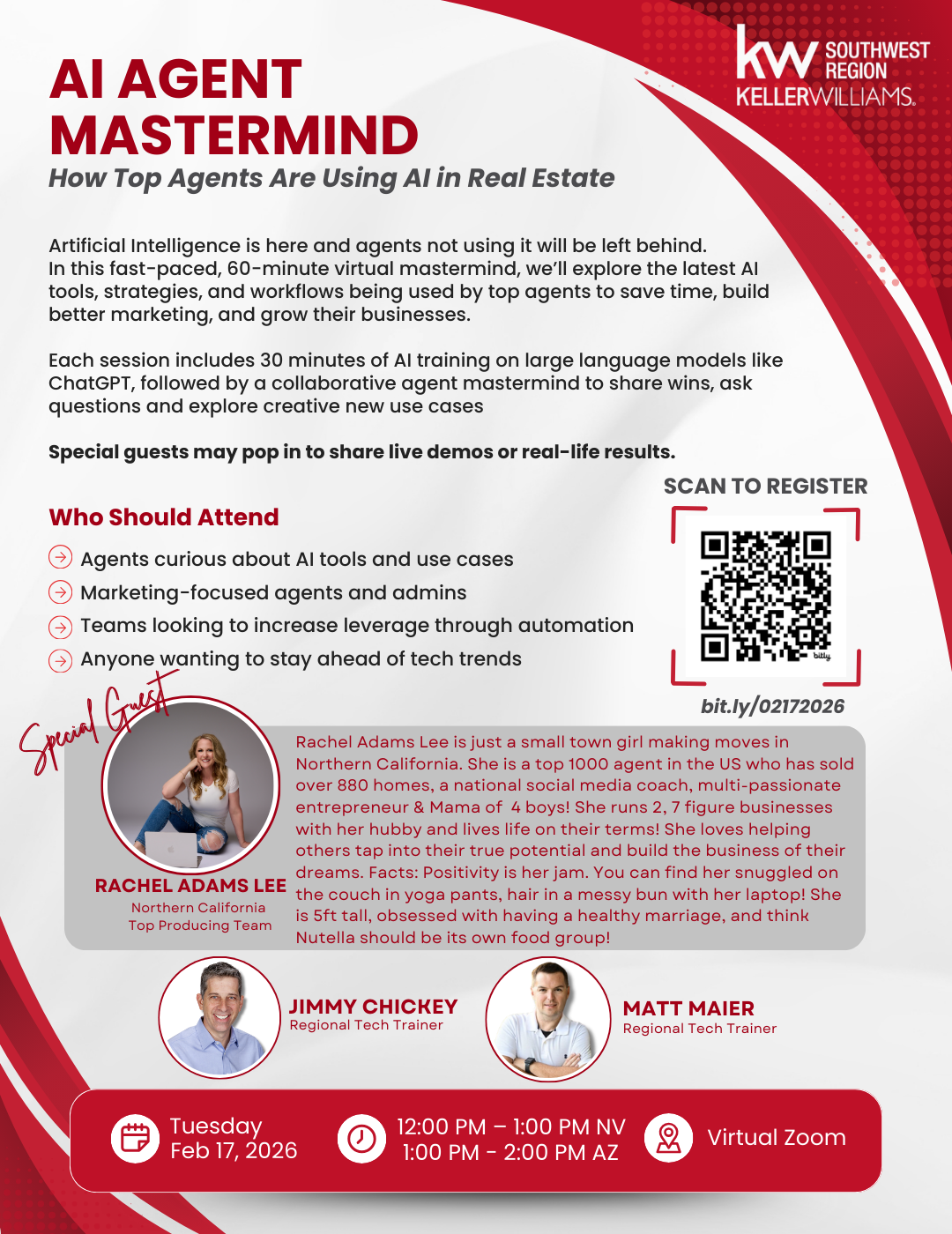 In this fast-paced, 60-minute virtual mastermind, we’ll explore the latest Al tools, strategies, and workflows being used by top agents to save time, build better marketing, and grow their businesses.