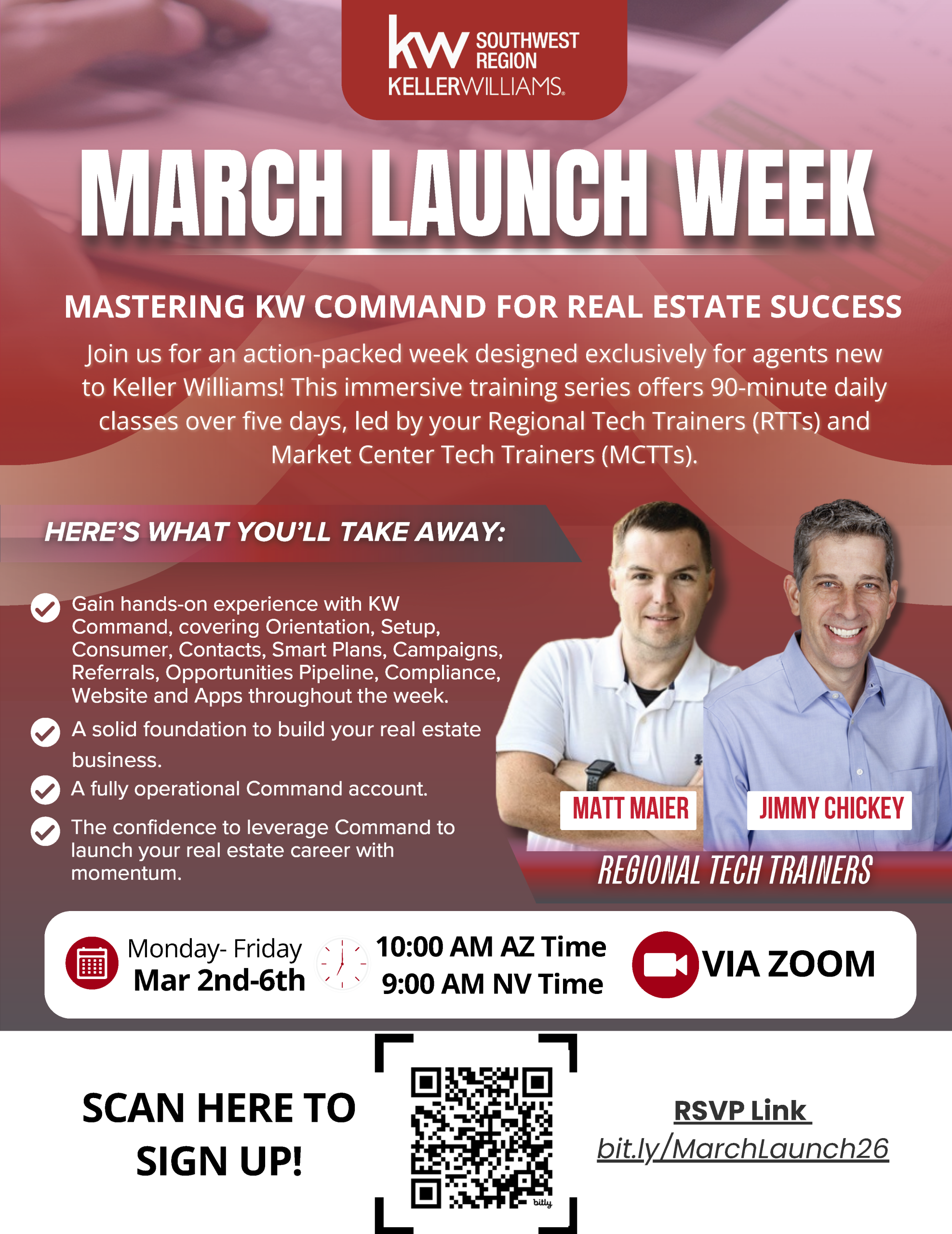 • Gain hands-on experience with KW Command, covering Orientation, Setup, Consumer, Contacts, Smart Plans, Campaigns, Referrals, Opportunities Pipeline, Compliance, Website and Apps throughout the week.