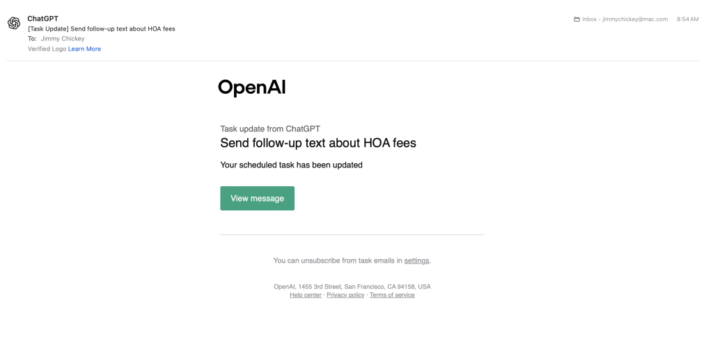“I just showed a 3-bedroom home in Summerlin to a couple relocating from California. They loved the backyard but were concerned about HOA fees. Write a follow-up text and remind me at 8pm to send it.”